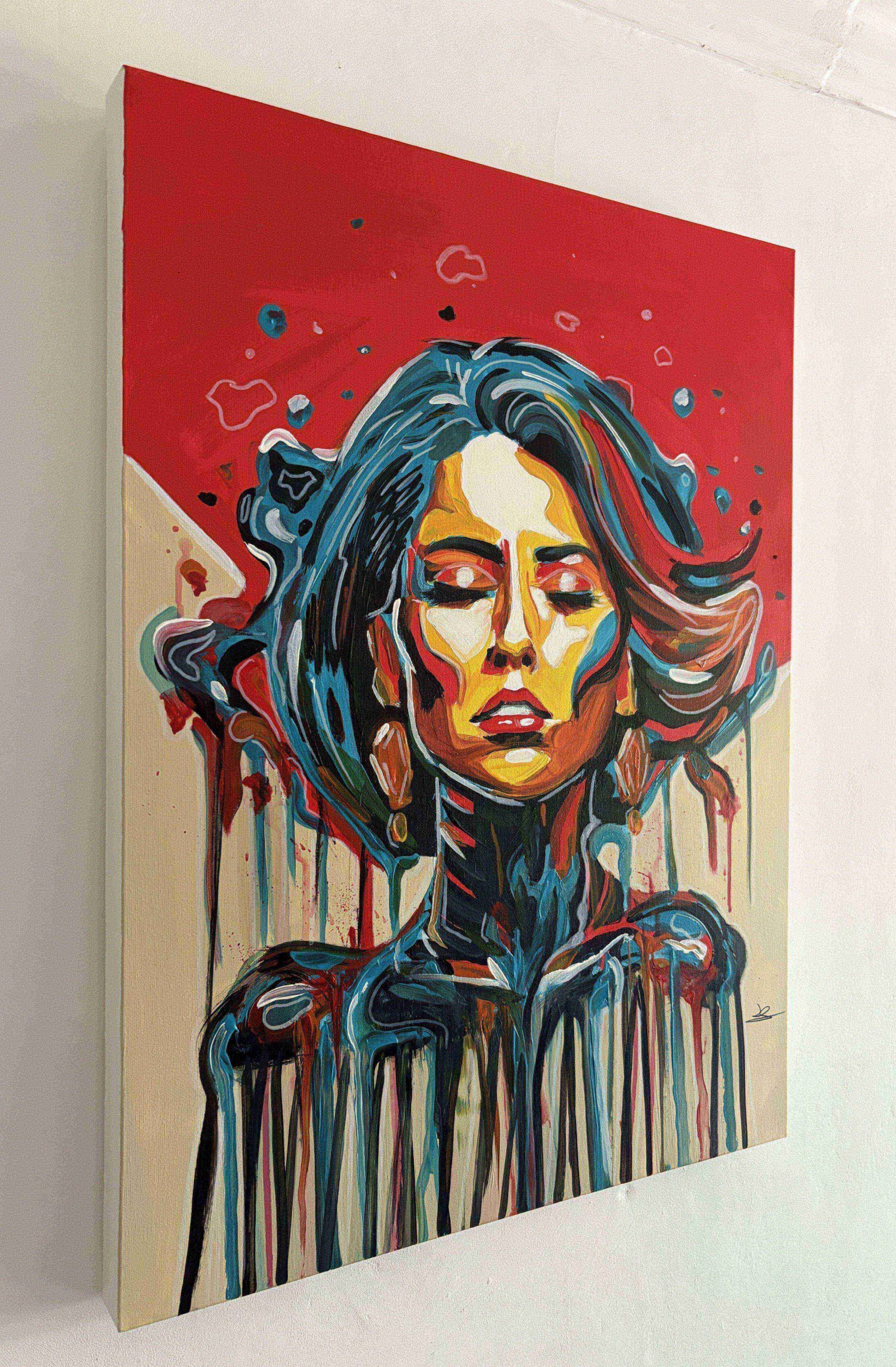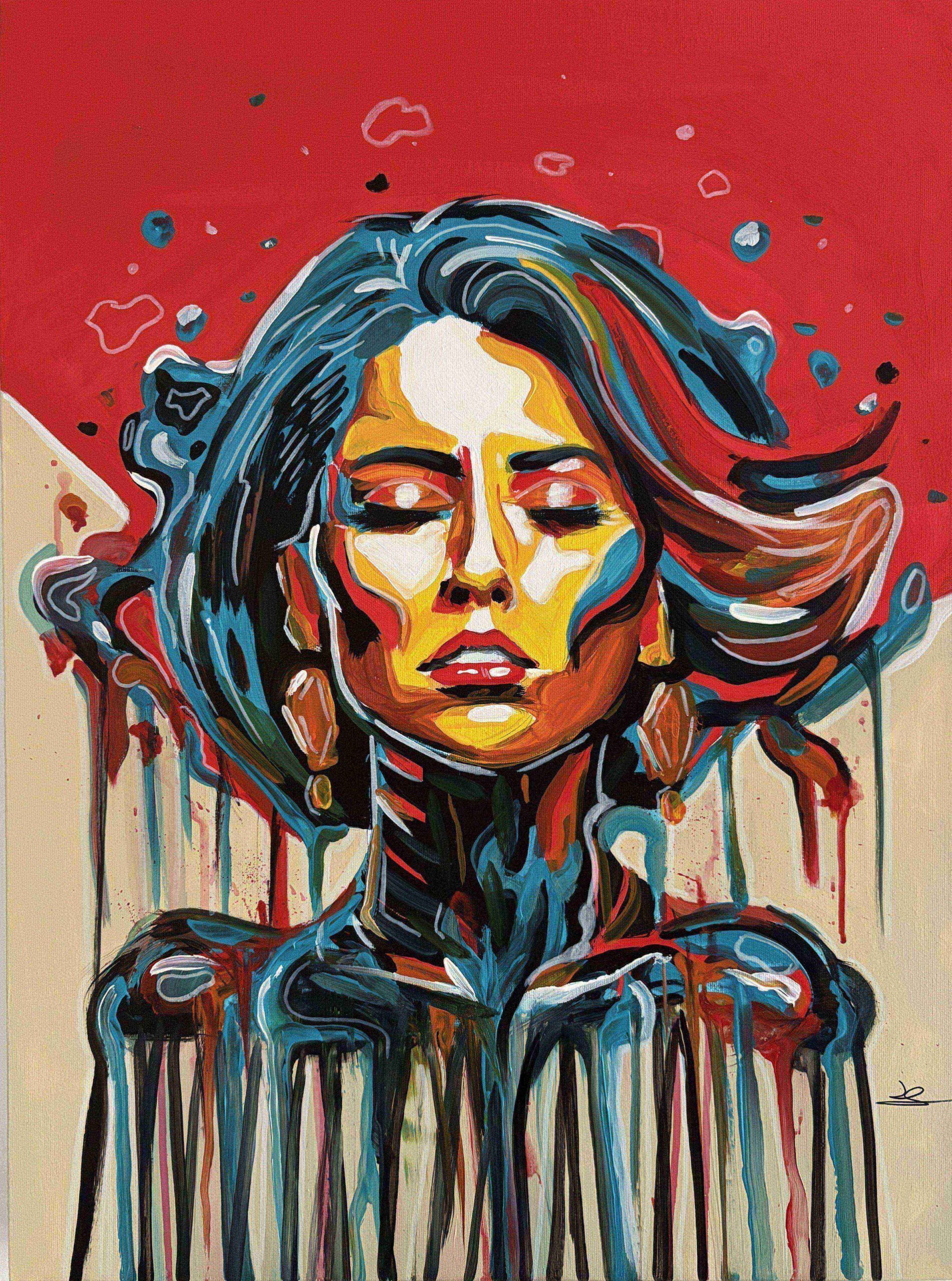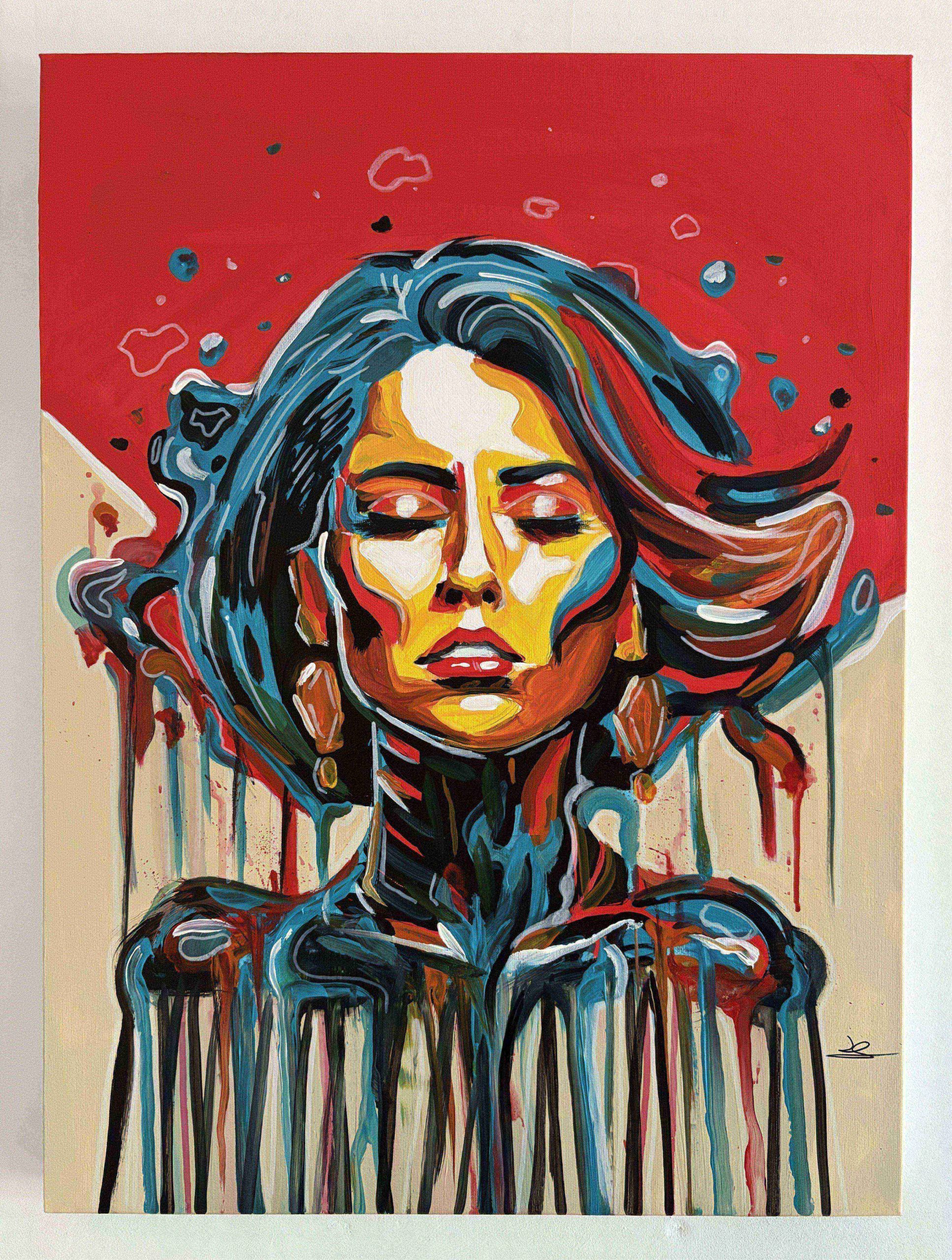 Medium: Acrylic and ink on a triple gesso-primed canvas stretched over a lightweight wooden frame.