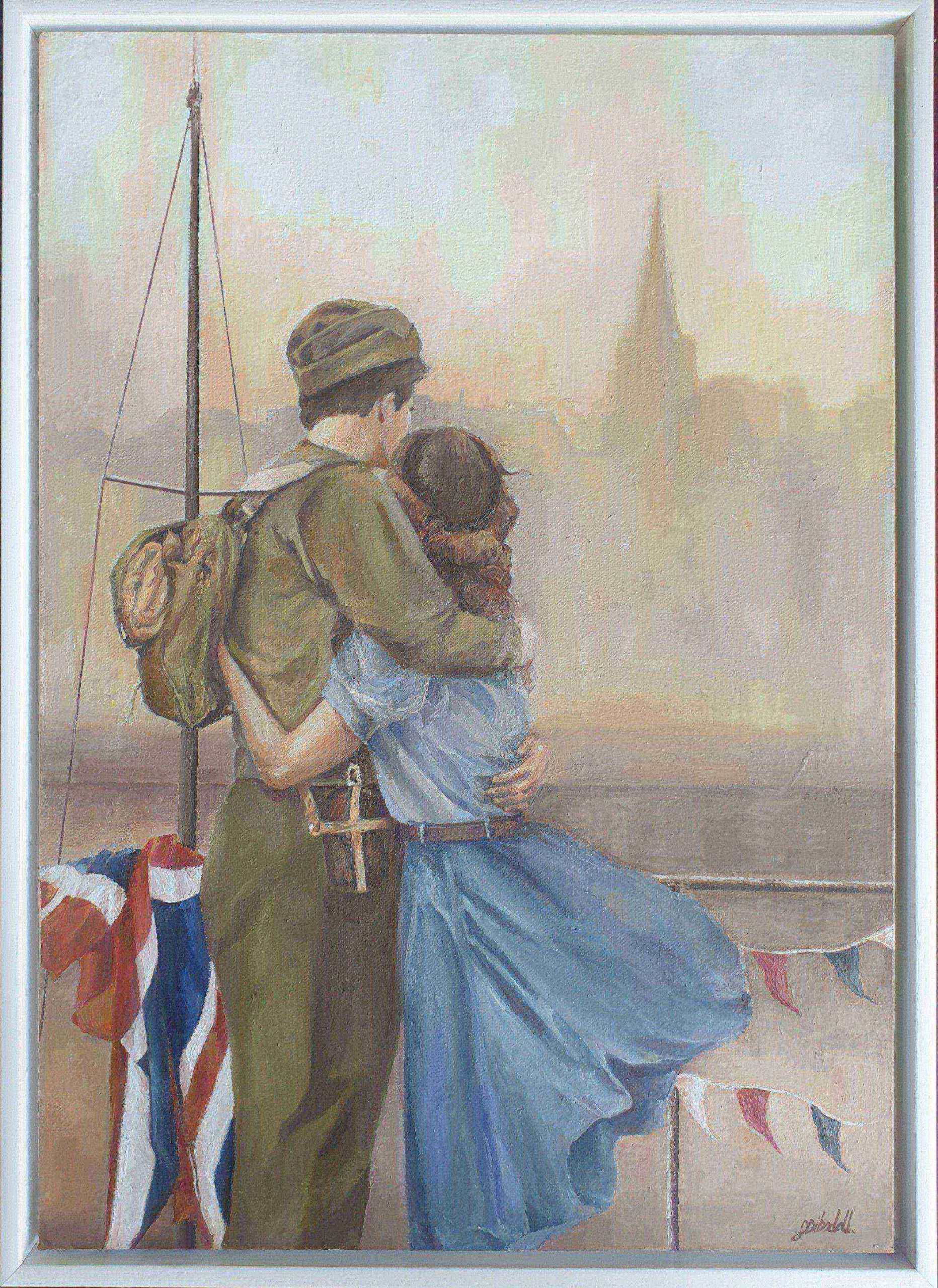 FramedThis painting depicts a young couple reunited after World War II. The couple are overlooking the harbour with bunting and Union Jack flags left from the celebrations. This painting has been displayed at London City Airport as part of the 80th anniversary of the Liberation of Guernsey. It was also the winner of the Sarnia Arts and Crafts Club publicity competition and was used on posters and flyers. The painting arrives framed and ready to hang with free delivery.