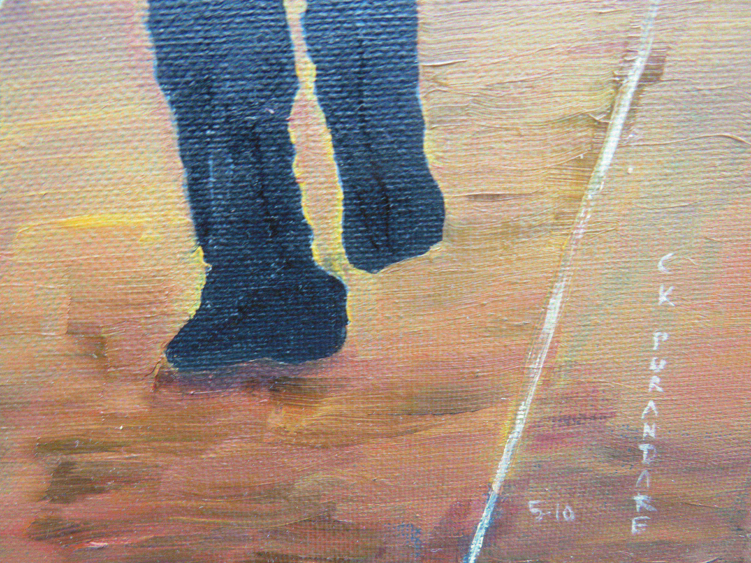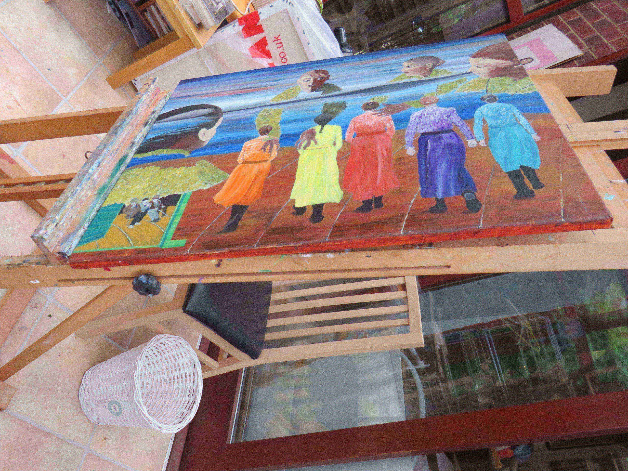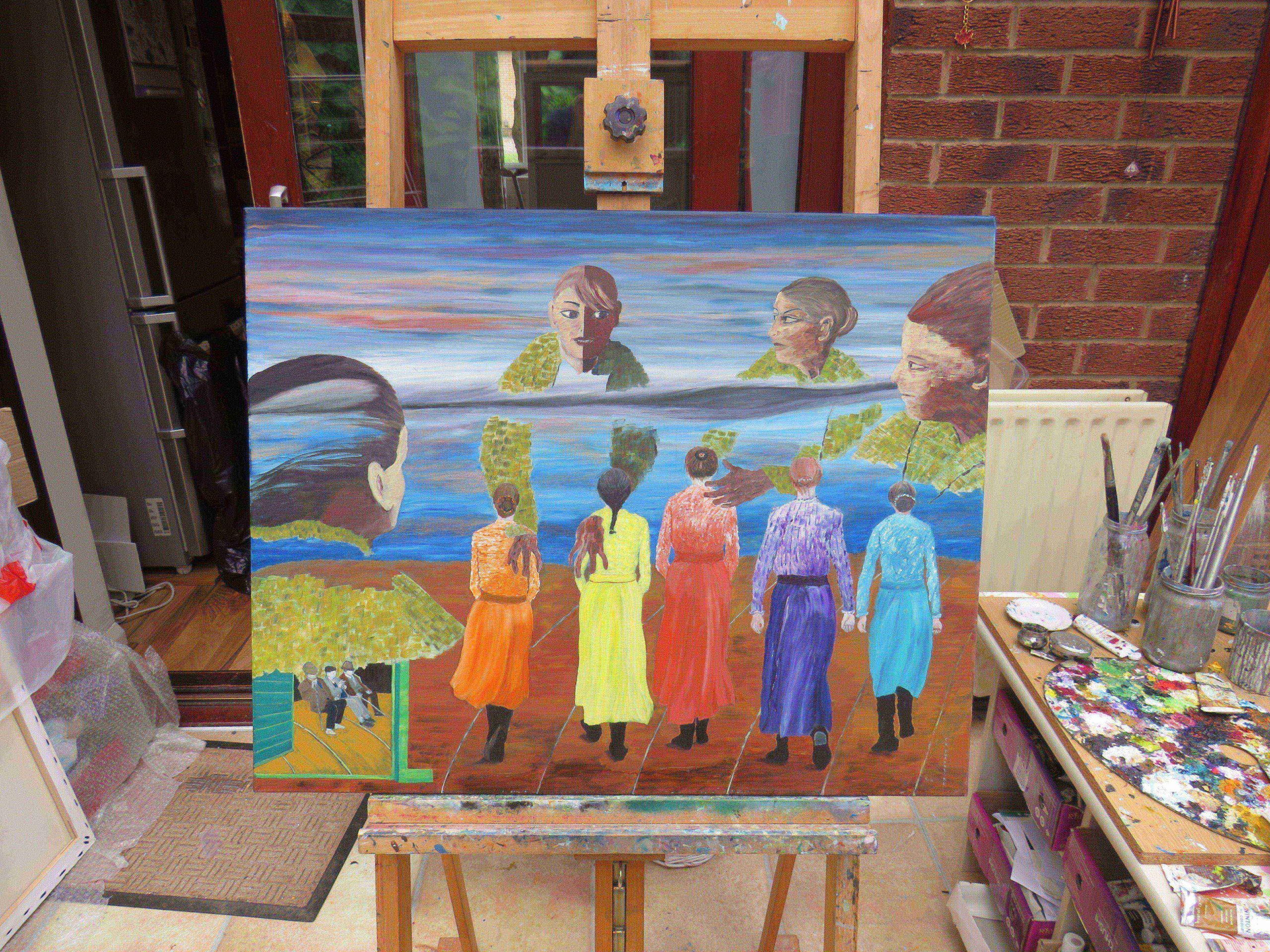 This painting shows women dressed in colourful clothing, marching. In the sky, there are military figures juxtaposed, as if to show that militarisation is coming.